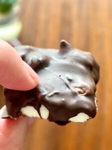 Bañarlos en chocolate, volverlos a llevar al freezer unos minutos hasta que el chocolate se endurezca.