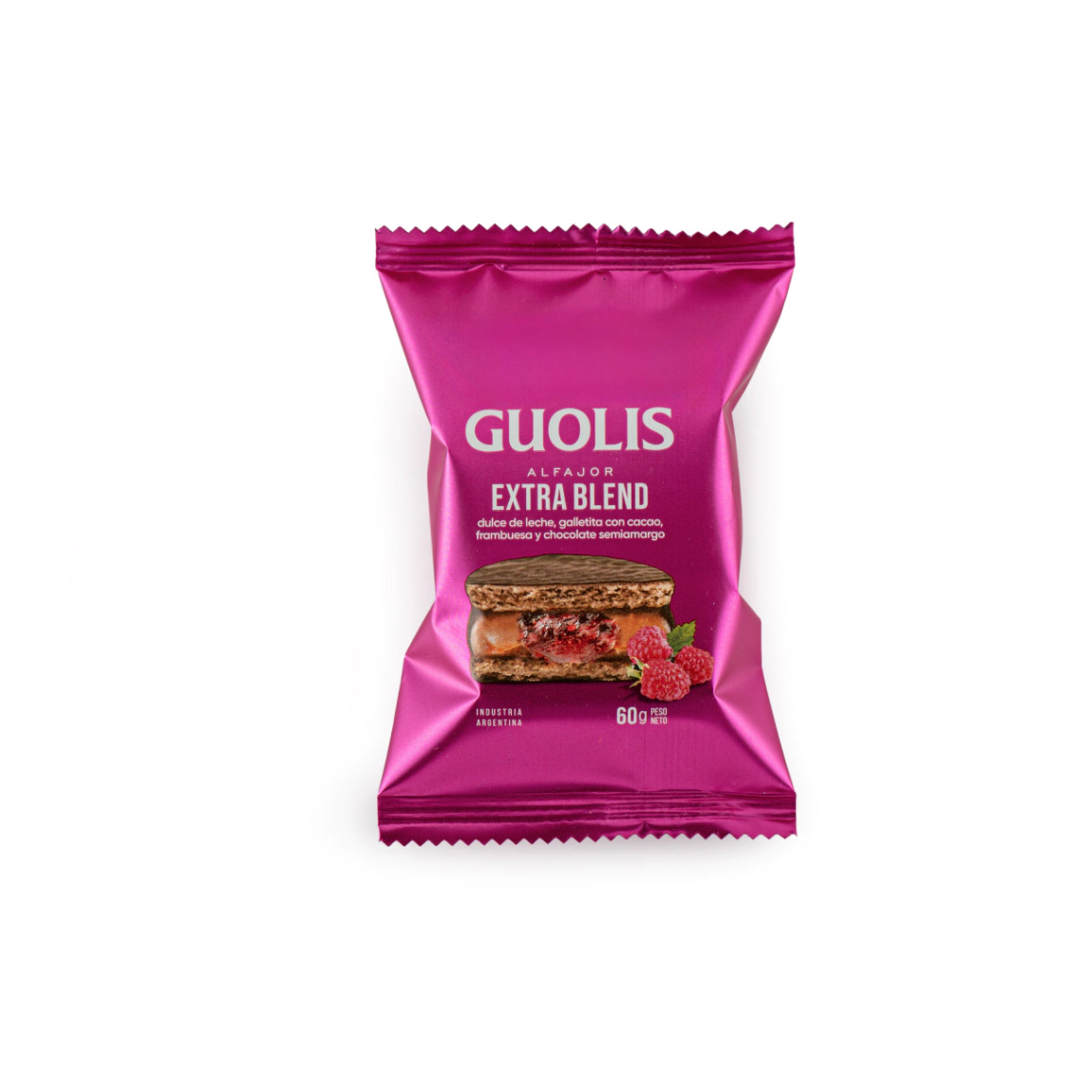 Alfajor extra blend con frambuesa, un dulce tentador con un balance perfecto entre chocolate y frambuesa. 60grs.